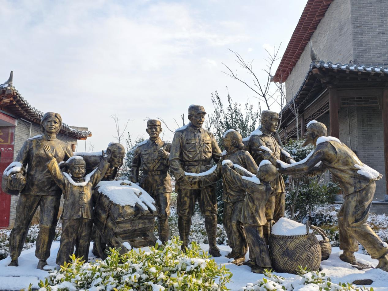 初雪过后,山城区石林镇刘邓红街的雕塑银装素裹,雪花落在雕塑的轮廓上,为硬朗的线条增添了几分柔和,却丝毫难掩那股昂扬向上的力量。(山城区纪委监委 孙钰婷 摄)