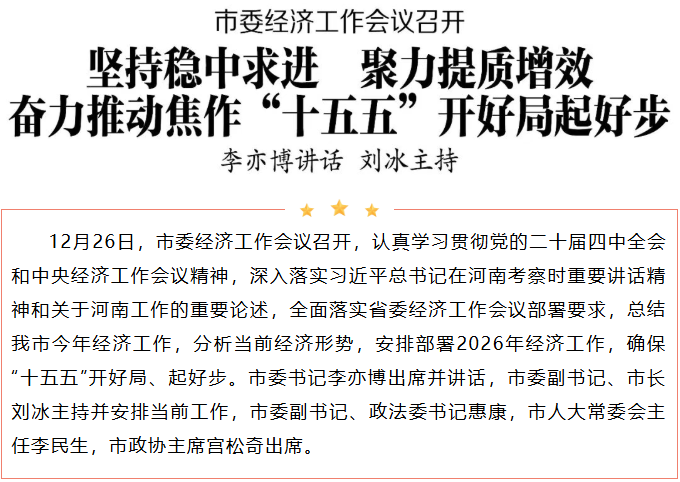 市委经济工作会议召开 坚持稳中求进 聚力提质增效 奋力推动焦作“十五五”开好局起好步 李亦博讲话 刘冰主持
