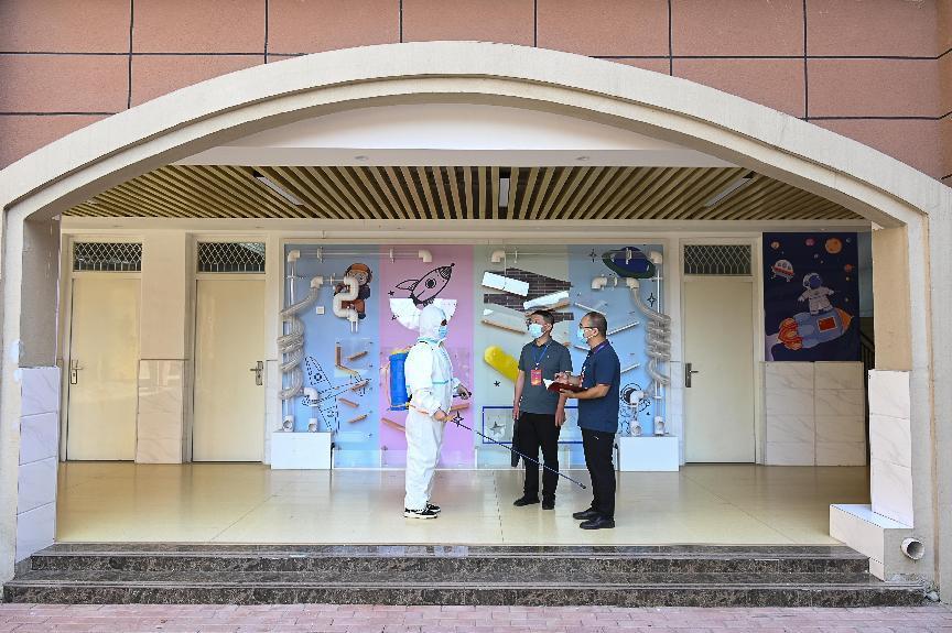 源汇区纪委监委派驻第九纪检监察组实地检查校园环境消杀措施落实情况。