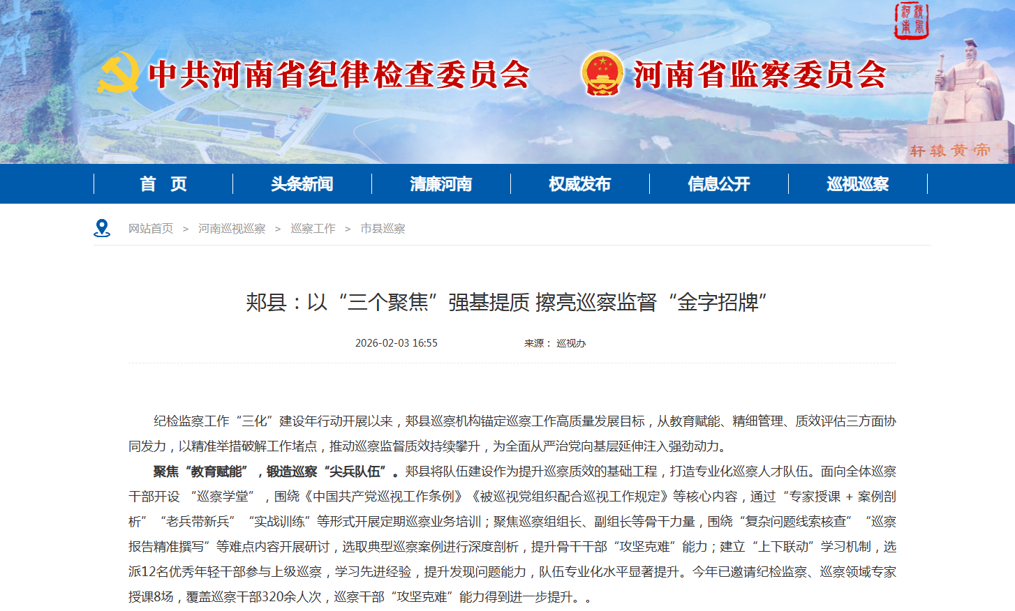 聚焦“教育赋能”,锻造巡察“尖兵队伍”。郏县将队伍建设作为提升巡察质效的基础工程,打造专业化巡察人才队伍。面向全体巡察干部开设 “巡察学堂”,围绕《中国共产党巡视工作条例》《被巡视党组织配合巡视工作规定》等核心内容,通过“专家授课 + 案例剖析”“老兵带新兵”“实战训练”等形式开展定期巡察业务培训;聚焦巡察组组长、副组长等骨干力量,围绕“复杂问题线索核查”“巡察报告精准撰写”等难点内容开展研讨,选取典型巡察案例进行深度剖析,提升骨干干部“攻坚克难”能力;建立“上下联动”学习机制,选派12名优秀年轻干部参与上级巡察,学习先进经验,提升发现问题能力,队伍专业化水平显著提升。今年已邀请纪检监察、巡察领域专家授课8场,覆盖巡察干部320余人次,巡察干部“攻坚克难”能力得到进一步提升。。