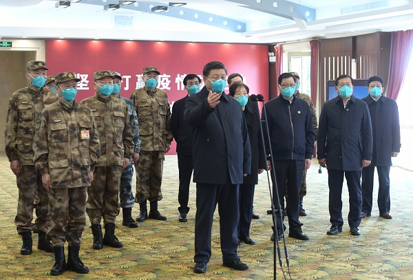 在火神山医院指挥中心,习近平听取医院建设运行、患者收治、医务人员防护保障、科研攻关等情况介绍。习近平指出,疫情发生以来,包括军队在内的广大医务工作者发扬特别能吃苦、特别能战斗的精神,义无反顾奔赴湖北和武汉,毫无畏惧投入防控救治工作,日夜奋战,舍生忘死,不负重托,不辱使命,同时间赛跑,与病魔较量,为武汉疫情防控工作作出了重要贡献。军队医务人员牢记我军宗旨,召之即来,来之能战,战之能胜,为党旗、军旗增添了光彩。沧海横流,方显英雄本色。你们真正做到了救死扶伤、大爱无疆。你们是光明的使者、希望的使者,是最美的天使,是真正的英雄!党和人民感谢你们!