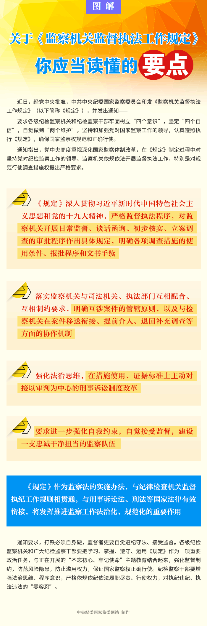 近日,经党中央批准,中共中央纪委国家监察委员会印发《监察机关监督执法工作规定》(以下简称《规定》),并发出通知,要求各级纪检监察机关和纪检监察干部牢固树立“四个意识”,坚定“四个自信”,自觉做到“两个维护”,坚持和加强党对国家监察工作的领导,认真遵照执行《规定》,确保国家监察权规范和正确行使。
