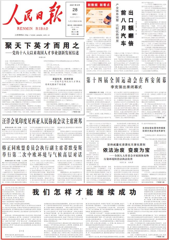 “万山磅礴看主峰”。拥有富有远见、成熟稳定的领导核心,是时代之幸,国之大幸,是党和国家砥砺前行、走向兴盛至关重要的因素。人民日报头版今天继续刊发“宣言”署名文章《我们怎样才能继续成功》指出,乘历史大势而上,走人间正道致远。在以习近平同志为核心的党中央坚强领导下,不断增强党的政治领导力、思想引领力、群众组织力、社会号召力,就没有任何困难能够压倒中国人民,没有任何惊涛骇浪能够阻挡中华巨轮。我们必将继续成功,我们必定能够成功!