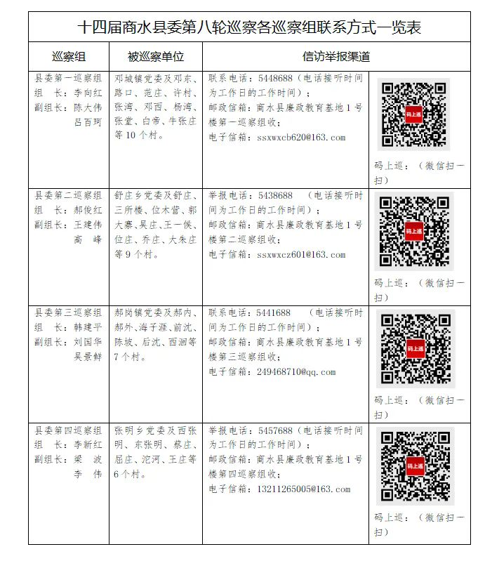 根据县委统一部署,截止4月9日,十四届县委第八轮巡察完成进驻。本轮巡察共派出4个巡察组,采取“乡村一体巡”的方式,分别对邓城镇党委及所辖的邓东等10个村、舒庄乡党委及所辖的舒庄等9个村、郝岗镇党委及所辖的郝内等7个村、张明乡党委及所辖的西张明等6个村开展巡察,时间为40天。